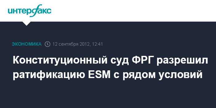 Карлсруэ. 12 сентября. INTERFAX.RU - Конституционный суд Германии в среду разрешил ратифицировать соглашения о создании Европейского механизма стабильности (European Stability Mechanism, ESM) при соблюдении ряда условий.
