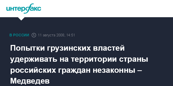 Москва. 11 августа. INTERFAX.RU - Президент РФ Дмитрий Медведев назвал неприемлемыми действия грузинских властей, которые, по поступающим сообщениям, пытаются насильно удерживать на территории своей страны российских граждан.