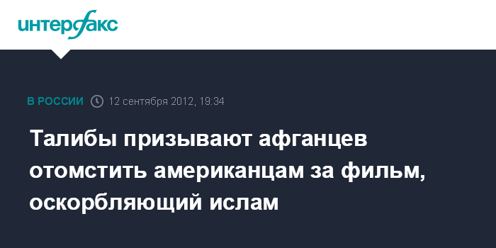 Кабул. 12 сентября. INTERFAX.RU - Движение "Талибан" призвало народ Афганистана отомстить американцам за фильм, оскорбляющий пророка Мухаммеда.