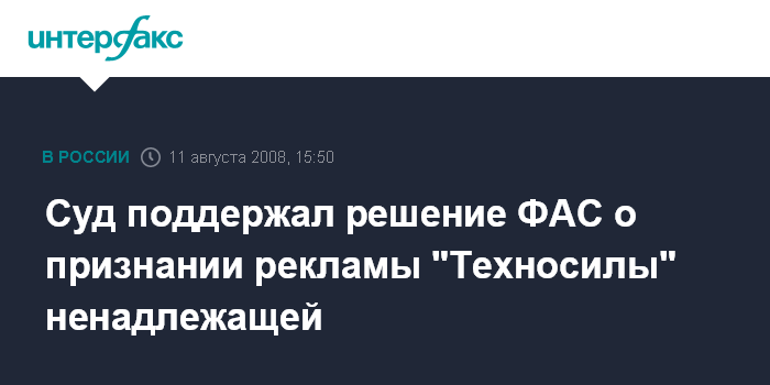 Цхинвали. 11 августа. INTERFAX.RU - Арбитражный апелляционный суд поддержал решение Федеральной антимонопольной службы (ФАС) о признании ненадлежащей рекламы с использованием товарного знака "Техносила", сообщает пресс-служба ведомства.