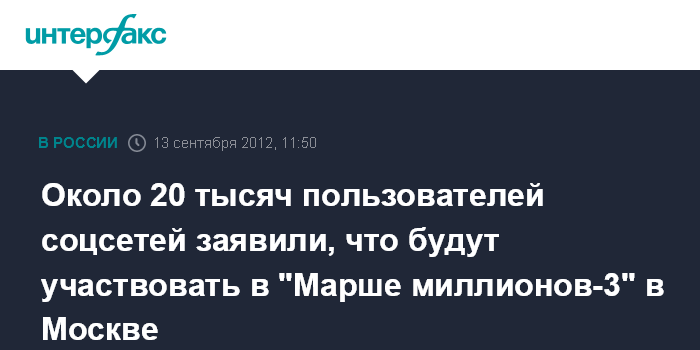 Москва. 13 сентября. INTERFAX.RU - Тысячи пользователей социальных сетей Facebook и ВКонтакте заявили, что примут участие в субботней акции "Марш миллионов-3" в Москве, свидетельствуют данные, опубликованные в официальных группах мероприятия.