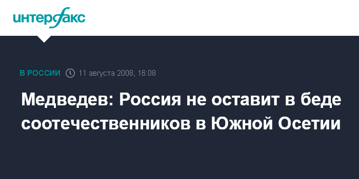 Цхинвали. 11 августа. INTERFAX.RU - Президент РФ Дмитрий Медведев заверил, что Россия не бросит в беде своих соотечественников, проживающих в Южной Осетии.