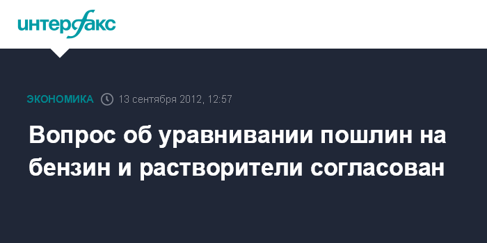 Москва. 13 сентября. INTERFAX.RU - Российские ведомства приняли единое решение, предполагающее уравнивание экспортных пошлин на бензин и растворители, сообщил агентству "Интерфакс" замминистра энергетики РФ Анатолий Яновский.