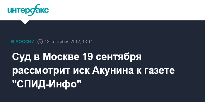 Как сообщила "Интерфаксу" в четверг пресс-секретарь суда Анастасия Семенова, к ним поступил иск Чхартишвили к редакции газеты "СПИД-Инфо". Она пояснила, что согласно исковому заявлению, в мае этого года газета опубликовала интервью с Акуниным под заголовком: "Первым делом иду на кладбище, а вторым - в публичный дом". Истец указал, что не давал подобного интервью газете, а также не сообщал никому, в том числе газете "СПИД-Инфо" сведения, распространенные в материале от его имени.