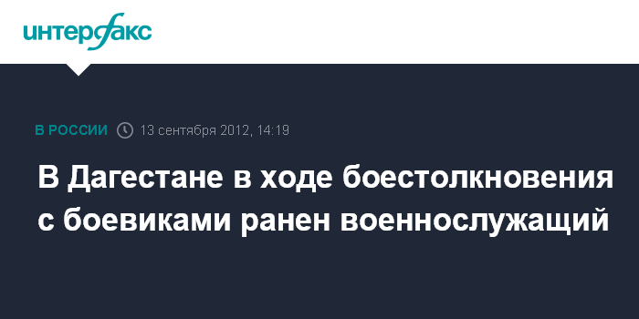 Ростов-на-Дону. 13 сентября. INTERFAX.RU - Военнослужащий внутренних войск получил ранение в результате боевого столкновения с неустановленной бандгруппой в Кизлярском районе (Дагестан), сообщили агентству "Интерфакс-Юг" источник в правоохранительных органах республики.