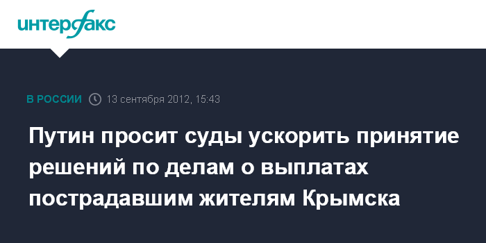 "Обращаю ваше внимание, что порядка 6 тыс. человек, а точнее 5 тыс. 913 граждан, все еще ждут решения судебных органов. И хочу обратиться к судебным инстанциям с просьбой ускорить рассмотрение этих дел", - заявил Путин на совещании по ликвидации последствий наводнения в Краснодарском крае.