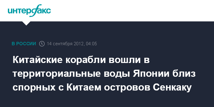 "Береговая охрана подтвердила, что около 6:20 утра в пятницу (1:20 мск) примерно в 22 километрах к северу от острова Тайсе в территориальные воды вошли два корабля китайского правительства, затем вошел еще один", - сообщают японские СМИ.