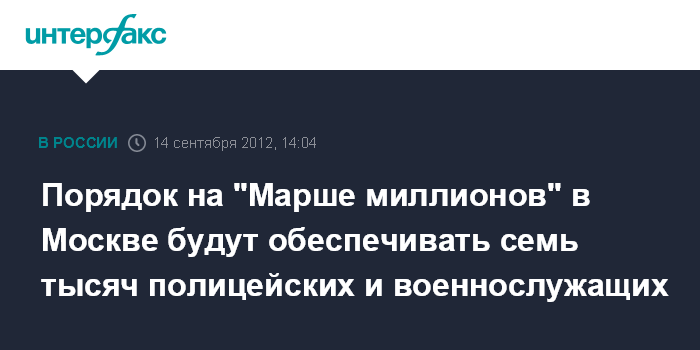 Москва. 14 сентября. INTERFAX.RU - Для обеспечения общественного порядка на "Марше миллионов" 15 сентября будут задействованы около 7 тыс. полицейских и военнослужащих внутренних войск, сообщили "Интерфаксу" в ГУ МВД РФ по Москве.