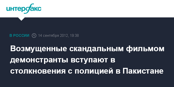 Исламабад. 14 сентября. INTERFAX.rU - Сотни человек участвуют в акциях протеста против фильма "Невинность мусульман" в разных районах Пакистана и вступают в столкновения с полицией, сообщает в пятницу пакистанский телеканал "Geo TV".