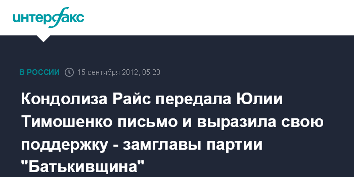 Киев. 15 сентября. ИНТЕРФАКС-УКРАИНА - Бывший государственный секретарь США Кондолиза Райс передала письмо бывшему премьер-министру Украины Юлии Тимошенко, сообщил заместитель главы партии "Батькивщина" Григорий Немыря.