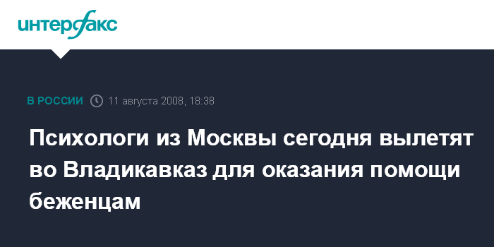 Москва. 11 августа. ИНТЕРФАКС - Группа российских психологов вылетит во вторник во Владикавказ для оказания помощи беженцам из Южной Осетии, сообщила министр здравоохранения и социального развития Татьяна Голикова.