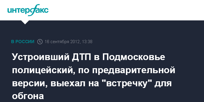 Москва. 16 сентября. INTERFAX.RU - Подмосковный полицейский, устроивший ДТП в Московской области, в котором погиб он сам, его коллега и гражданин Украины, умышленно выехал на встречную полосу, сообщила "Интерфаксу" официальный представитель ГСУ СК РФ по Московской области Ирина Гуменная.