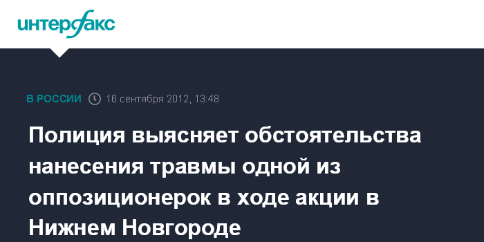 Москва. 16 сентября. INTERFAX.RU - В Нижегородской области начата служебная проверка по поводу нанесения травмы одной из участниц несанкционированной акции в Нижнем Новгороде, состоявшейся в минувшую субботу, сообщает в воскресенье пресс-центр МВД России.