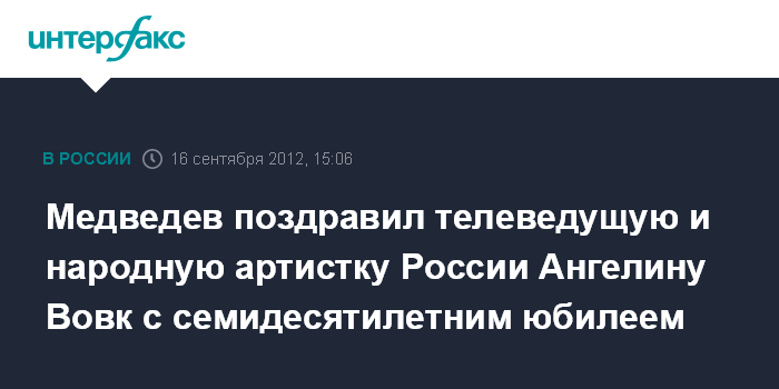 Москва. 16 сентября. INTERFAX.RU - Премьер-министр РФ Дмитрий Медведев направил поздравительную телеграмму телеведущей Ангелине Вовк, отмечающей в воскресенье юбилей, сообщает сайт главы правительства.