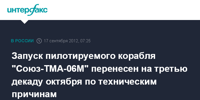Запуск пилотируемого корабля "Союз-ТМА-06М" перенесен на третью декаду октября по техническим причинам