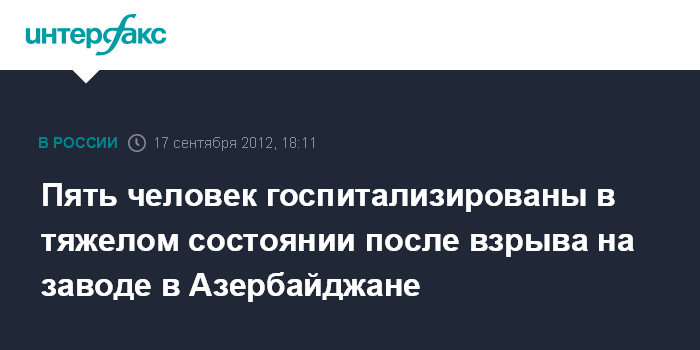 Баку. 17 сентября. INTERFAX.RU - В результате взрыва на одном из заводов Сумгаита по меньшей мере пять человек получили тяжелые травмы, сообщили агентству "Интерфакс" в Минздраве.