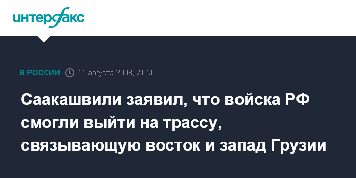 Брюссель. 11 августа. INTERFAX.RU - Президент Грузии Михаил Саакашвили заявляет, что российские войска вышли на трассу, которая связывает восточный и западный регионы страны.