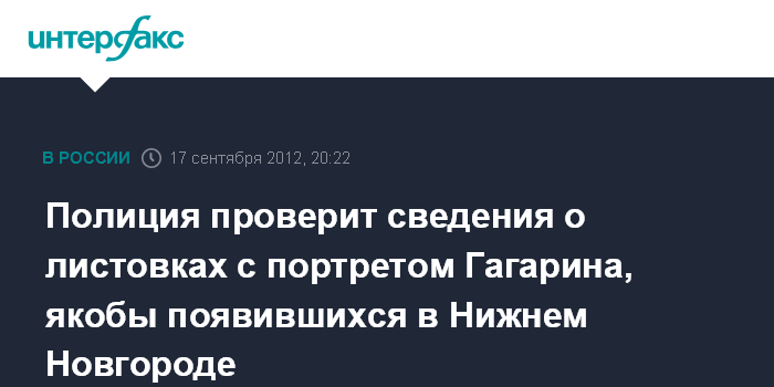 Нижний Новгород. 17 сентября. INTERFAX.RU- Полиция проводит проверку по опубликованной в Интернете информации о появлении на улицах Советского района Нижнего Новгорода листовок с изображением Юрия Гагарина, сообщила агентству "Интерфакс" начальник пресс-службы УМВД России по городу Алена Чеботкова.