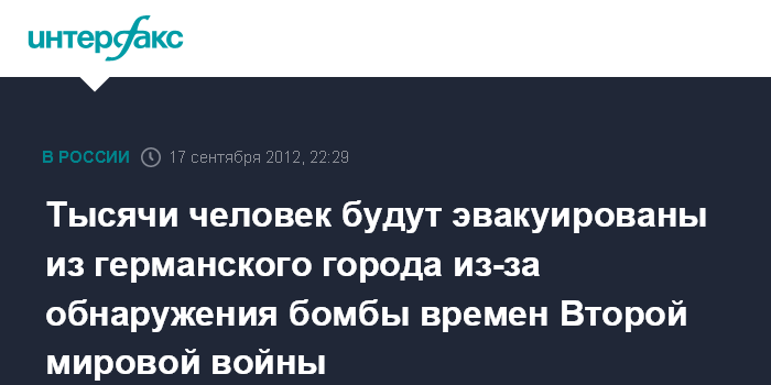 Берлин. 17 сентября. INTERFAX.RU - Власти ФРГ эвакуируют несколько тысяч человек из города Фирзен в федеральной земле Северный Рейн-Вестфалия из-за обнаружения в нем бомбы времен Второй мировой войны, сообщил в понедельник журналистам представитель местных властей.