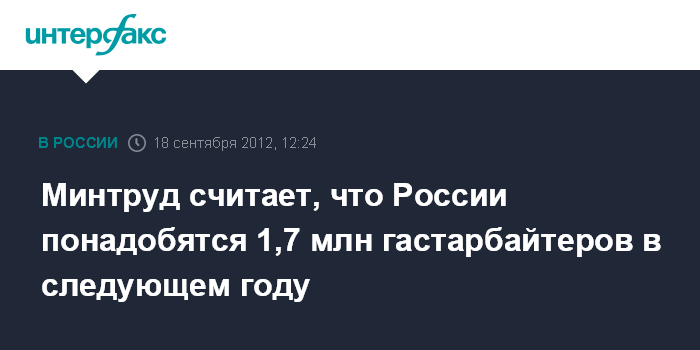 Москва. 18 сентября. INTERFAX.RU - Министерство труда России предлагает правительству определить число иностранных работников в 2013 г. численностью свыше 1,7 млн. Об этом говорится в проекте постановления правительства РФ, подготовленном министерством.