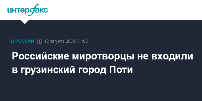Москва. 12 августа. INTERFAX.RU - Представитель Минобороны РФ заявил, что российские миротворческие части не входили в грузинский город-порт Поти. "Такой задачи перед ними никогда не ставилось", - сказал он. По его словам, "в городе кратко побывала разведка, которая уже покинула его".