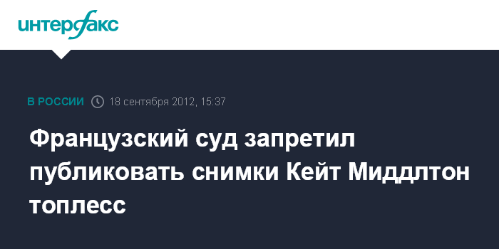 Париж. 18 сентября. INTERFAX.RU - Суд французского города Нантера ввел запрет на продажу, распространение и дальнейшую публикацию фотографий полуобнаженной герцогини Кембриджской, сообщает во вторник парижский журнал L'Express.