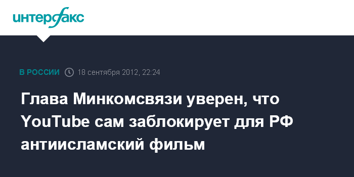 Москва. 18 сентября. INTERFAX.RU - Видеохостинг YouTube, принадлежащий Google, ограничит для российских пользователей просмотр фрагментов фильма "Невинность мусульман" после принятия судом решения о признании его экстремистским, полагает глава Минкомсвязи РФ Николай Никифоров.