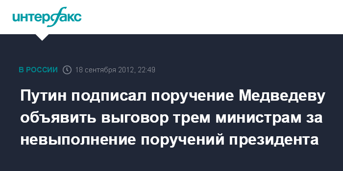 Ранее в ходе совещания по проекту бюджета на 2013 - 2015 годы Путин поручил сделать выговор главам Министерства труда и Минрегионразвития.
