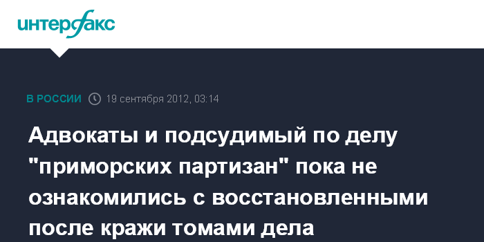 Владивосток. 19 сентября. ИНТЕРФАКС-ДАЛЬНИЙ ВОСТОК - Приморский краевой суд пока не рассматривал вопрос о приобщении к основным материалам трех восстановленных томов уголовного дела так называемых "приморских партизан".