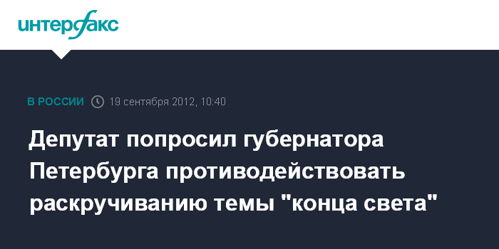 Санкт-Петербург. 19 сентября. INTERFAX.RU - Депутат Законодательного собрания Санкт-Петербурга Андрей Горшечников обратился к руководству города с депутатским запросом об ограничении муссирования темы "конца света", передал корреспондент "Интерфакса".