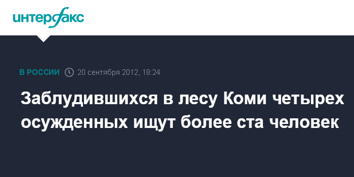 Сыктывкар. 20 сентября. INTERFAX.RU - Четырех осужденных из исправительной колонии №34 поселка Вожский Удорского района Коми, потерявшихся в лесу во время сбора ягод и грибов, ищут более ста человек, сообщили "Интерфаксу" в пресс-службе регионального ГУФСИН в четверг.