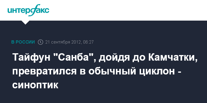 Петропавловск-Камчатский. 21 сентября. ИНТЕРФАКС-ДАЛЬНИЙ ВОСТОК - Тайфун "Санба", натворивший бед в Приморье и на Сахалине, дойдя до Камчатки, ослаб до обычного циклона, сообщила агентству "Интерфакс - Дальний Восток" в пятницу начальник отдела метеопрогнозов камчатского гидрометеоцентра Анна Приходько.