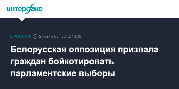 Минск. 21 сентября. INTERFAX.RU - Представители шести оппозиционных структур Беларуси выступили с единым призывом не участвовать в выборах в Палату представителей Национального собрания страны, сообщил на пресс-конференции в пятницу в Минске лидер Объединенной гражданской партии (ОГП) Анатолий Лебедько.