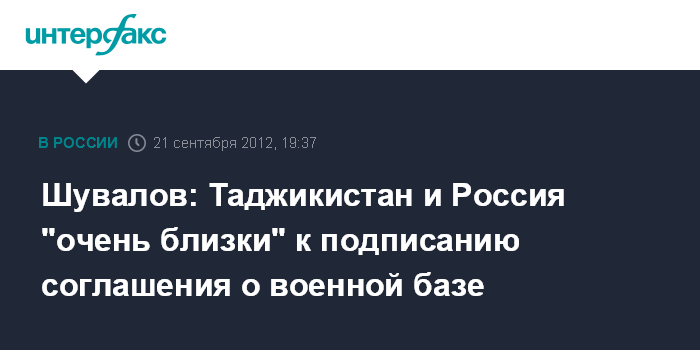 Душанбе. 21 сентября. INTERFAX.RU - Душанбе и Москва "очень близки" к подписанию соглашения о дислокации в Таджикистане 201-й российской военной базы (РВБ) - крупнейшего сухопутного военного объекта РФ за ее пределами, заявил журналистам в пятницу первый вице-премьер России Игорь Шувалов.