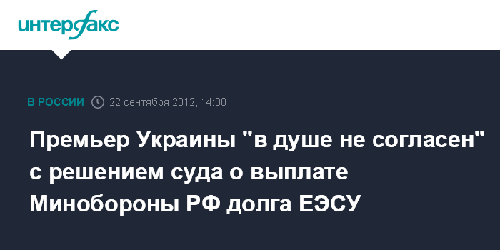 Москва. 22 сентября. INTERFAX.RU – Премьер-министр Украины Николай Азаров подтвердил, что Украина в апелляционном порядке обжалует решение Хозяйственного суда Киева о выплате украинским правительством Министерству обороны РФ более 3,1 млрд грн (около $390 млн) долгов корпорации "Единые энергетические системы Украины" (ЕЭСУ).