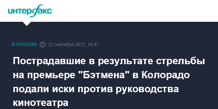 Москва. 22 сентября. INTERFAX.RU – Граждане США, получившие ранения в результате нападения Джеймса Холмса в городе Аврора на премьере фильма о Бэтмене, подали иски в суд против владельцев кинотеатра - компании Cinemark USA, сообщает издание "Денвер пост".