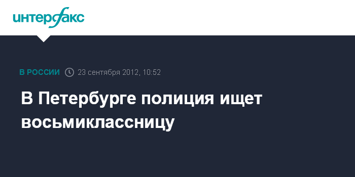 Москва. 23 сентября. INTERFAX.RU - Восьмиклассница пропала в Санкт-Петербурге четыре дня назад, полиция просит граждан помочь в поисках, сообщается в воскресенье на сайте ГУ МВД России по Санкт-Петербургу и Ленинградской области.