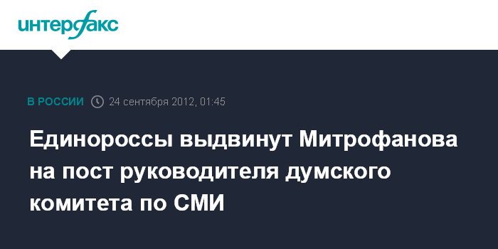 Москва. 24 сентября. ИНТЕРФАКС - Руководство фракции "Единая Россия" в понедельник собирается обсудить кандидатуру Алексея Митрофанова на пост главы нового комитета Госдумы - по СМИ.