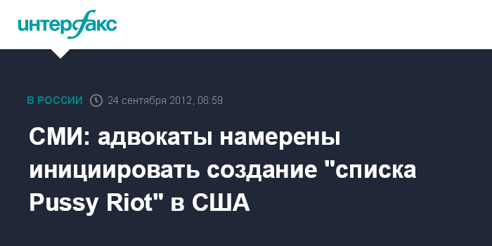 Москва. 24 сентября. INTERFAX.RU - Адвокаты осужденных девушек из панк-группы "Pussy Riot" намерены лоббировать создание в США "списка Pussy Riot" по аналогии со знаменитым "списком Магнитского", пишет газета "Известия" в понедельник.