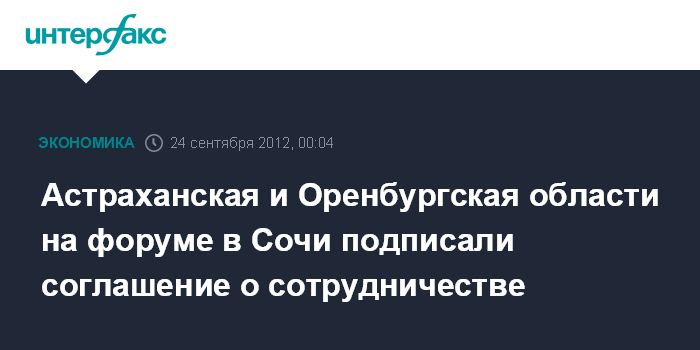 Сочи. 24 сентября. INTERFAX.RU - Астраханская и Оренбургская области на международном инвестиционном форуме "Сочи-2012" подписали соглашение о сотрудничестве, сообщил корреспондент агентства "Интерфакс-Юг" с церемонии подписания.