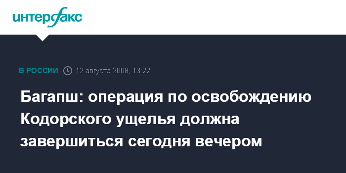 Москва. 12 августа. INTERFAX.RU – Президент Абхазии Сергей Багапш в интервью "Интерфаксу" выразил уверенность, что операция в верхней части Кодорского ущелья к вечеру сегодняшнего дня будет завершена.