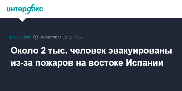 Мадрид. 24 сентября. INTERFAX.RU - Около двух тыс. человек пришлось эвакуировать из-за сильных лесных пожаров в испанской провинции Валенсия, сообщили в понедельник в местной службе полиции.