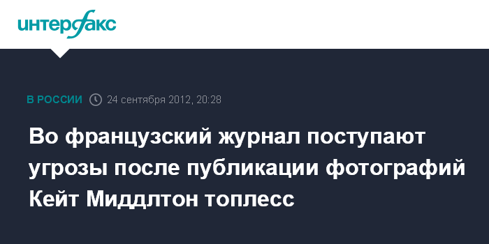 Париж. 24 сентября. INTERFAX.RU - Редактор журнала Closer Лоранс Пио начала получать письма с угрозами после публикации фотографий полуобнаженной герцогини Кембриджской Кейт Миддлтон, сообщили в понедельник в издании.