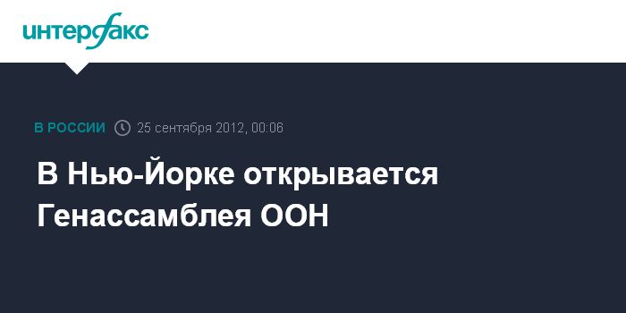 Нью-Йорк (ООН). 25 сентября. ИНТЕРФАКС - 67-я сессия Генеральной Ассамблеи ООН открывается во вторник в Нью-Йорке.