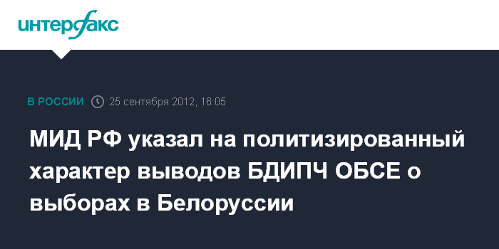 Москва. 25 сентября. INTERFAX.RU - МИД РФ отмечает свободный и открытый характер парламентских выборов в Белоруссии и сожалеет об "особом" мнении Бюро по демократическим институтам и правам человека (БДИПЧ) ОБСЕ по этому вопросу.