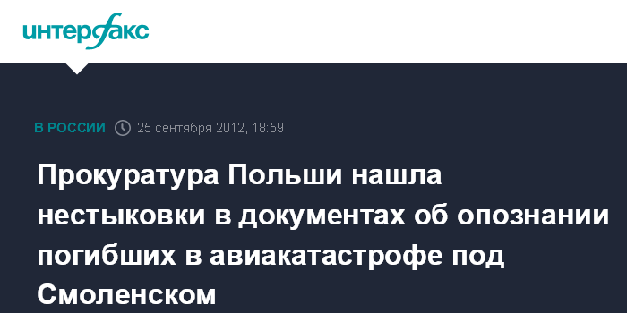 Варшава. 25 сентября. INTERFAX.RU - Родственники нескольких поляков, погибших в авиакатастрофе под Смоленском 10 апреля 2010 года, могли по ошибке получить для захоронения останки других жертв, а не их близких, сообщила во вторник польская прокуратура.