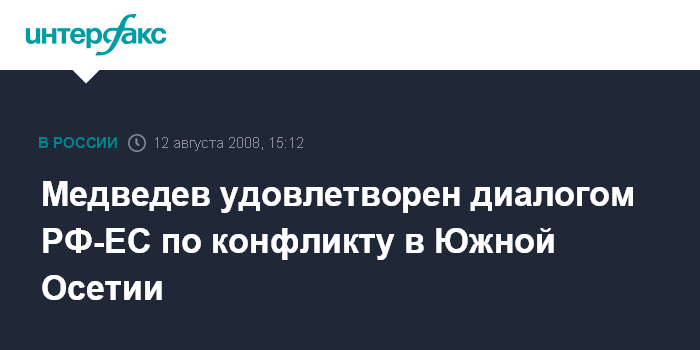 Москва. 12 августа. INTERFAX.RU - Президент РФ Дмитрий Медведев выразил удовлетворение "интенсивным диалогом между Россией и ЕС для поиска действенных решений в интересах обеспечения долгосрочной стабильности и безопасности в регионе грузино-югоосетинского конфликта", сообщила прессслужба Кремля.