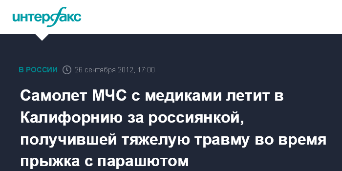 Москва. 26 сентября. INTERFAX.RU - МЧС РФ эвакуирует из Лос-Анджелеса в Москву получившую травму во время группового прыжка российскую парашютистку.