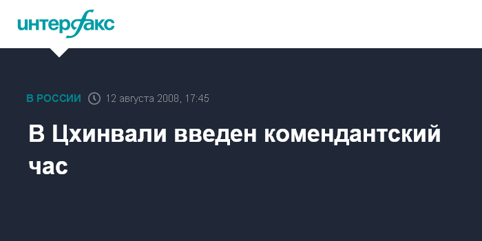 Цхинвали. 12 августа. INTERFAX.RU - В Цхинвали по решению правительства республики введен комендантский час, передает корреспондент "Интерфакса". Как сообщается, с 19:00 12 августа до 6:00 утра на улицах нельзя появляться людям с оружием.