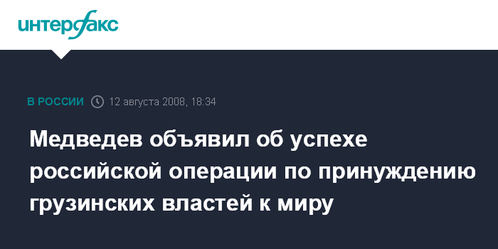 "Операция по принуждению грузинских властей к миру, которая велась усиленным российским миротворческим контингентом, принесла свои результаты, и поэтому мы ее закончили", - заявил он во вторник на пресс-конференции по итогам переговоров с президентом Франции Николя Саркози.